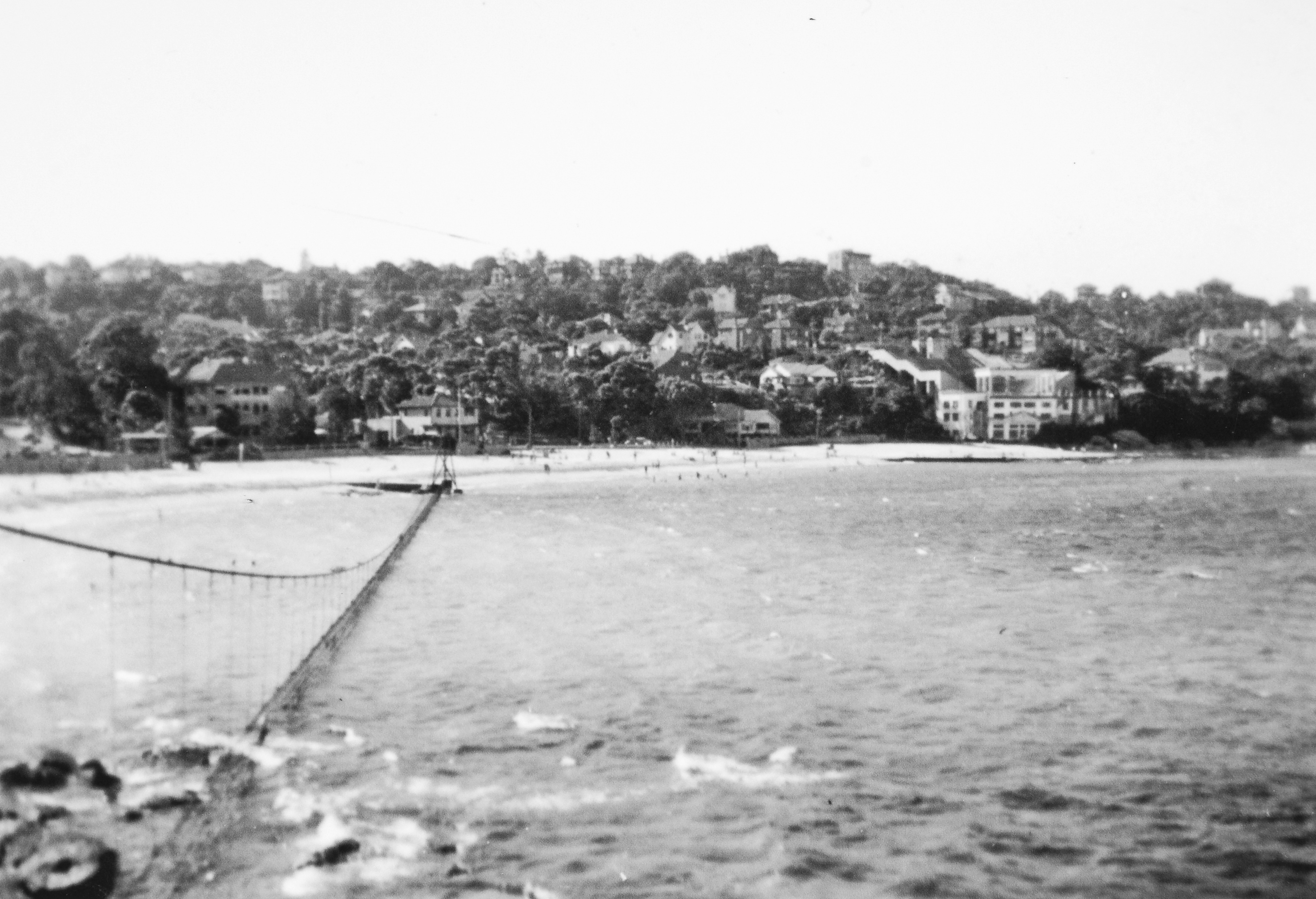 After much debate, the steel net enclosure was erected in 1935. It was suspended between steel cables that extended from anchor posts on Rocky Point (often known as ‘The Island’) to a steel tripod tower on a small rocky outcrop at Edwards Beach’s northern end. The net was taken down at the end of each summer.